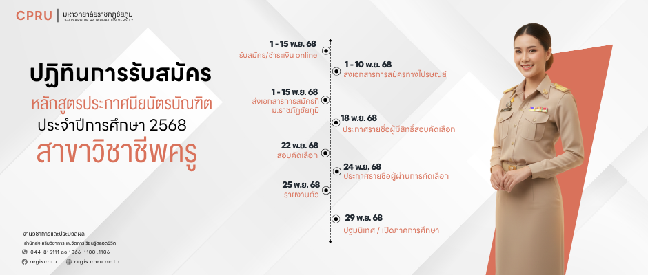ประกาศมหาวิทยาลัยราชภัฏชัยภูมิ เรื่อง การรับสมัครบุคคลเข้าศึกษาระดับประกาศนียบัตรบัณฑิต หลักสูตรประกาศนียบัตรบัณฑิต สาขาวิชาชีพครู ประจำปีการศึกษา 2568